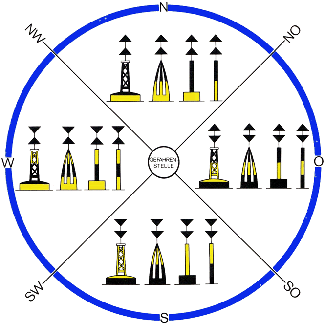 Das Quadrantenschema der Kardinalzeichen zeigt die vier Kardinalrichtungen (Nord, Ost, Süd, West) und wie sie um eine Gefahrenstelle angeordnet werden. Ein Kardinalzeichen zeigt an, auf welcher Seite du sicher passieren kannst.
